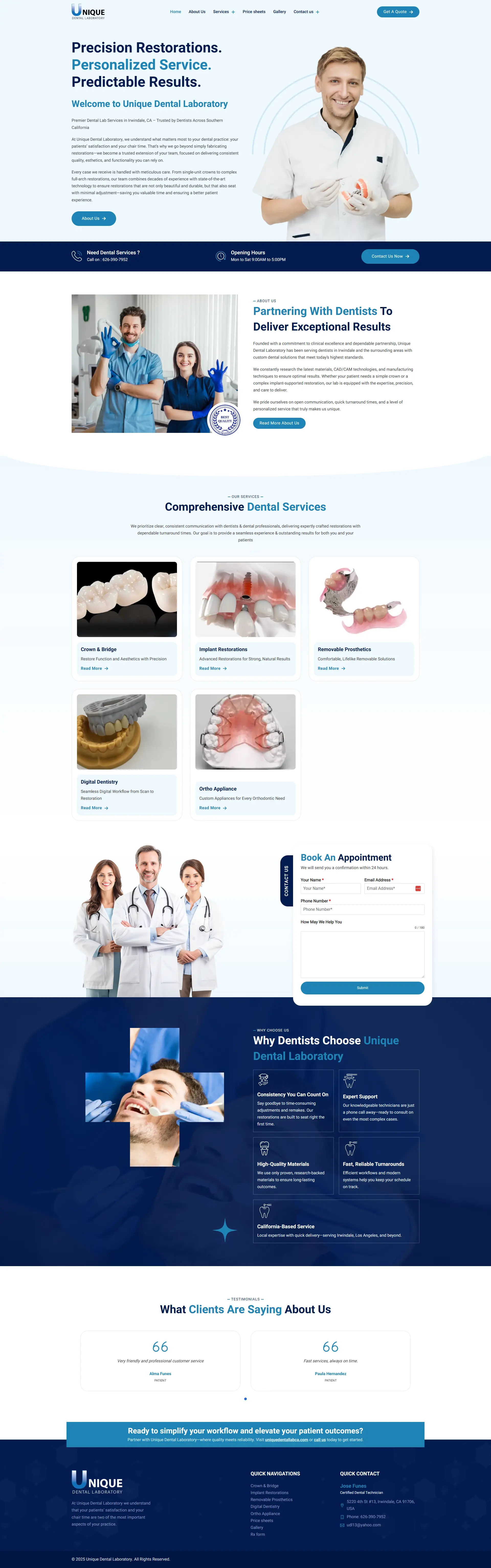 Unique Dental Laboratory in Irwindale delivers precision CAD/CAM restorations, implant-solutions and full-service prosthetics for dental professionals. I crafted their website to showcase their advanced digital workflows and commitment to quality and reliability.